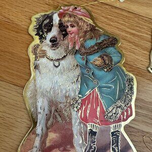Christmas Reproductions Inc Victorian Christmas Cardboard Ornaments Lot of 11. Also included Merrimack Publishing Company booklets. One is Little Flower Girl with six different cut-out dolls and the other is All about Santa Claus. Both printed in Hong Kong. Ornaments with gold foil and young children. Some of the ornaments are marked Christmas Reproductions Inc with 1984 or 1985. All in excellent condition. The booklets have price tags.
