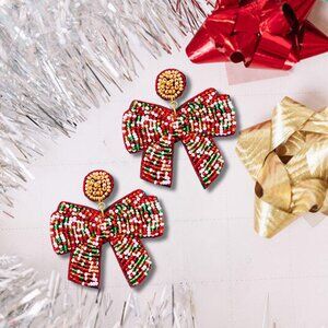 Christmas Ribbon Seed Beaded Statement Gift Colorful Bow Earrings NEW