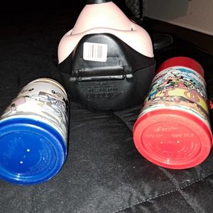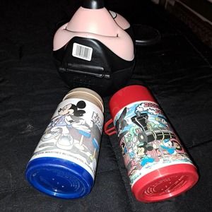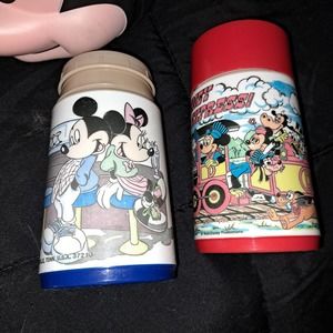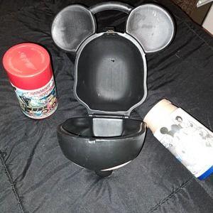 Vintage Aladdin Mickey Mouse Head lunch box in perfect condition and 2 VERY Vintage Aladdin Disney collectable thermoses. The Thermoses DO NOT fit into the Mickey Mouse Lunch box. The Mickey Mouse lunch box had a special made thermos that is not included. The Vintage collectable thermoses - 1 in fantastic shape and the other is slightly worn with age. Both are rare and adorable!