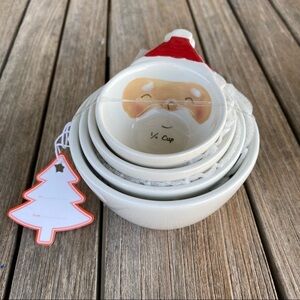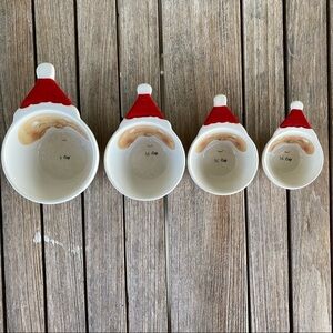 Brand new! Christmas Santa Claus ceramic measuring cups. Includes 1 cup, 1/2 cup, 1/3 cup & 1/4 cup. Absolutely adorable for your tiered tray, farmhouse decor or Christmas baking!
