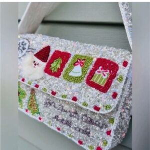 This elegant holiday bag features a shimmering silver base with vibrant red and green beaded Christmas accents.