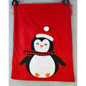 Festive Christmas Santa sack gift bags set of 2 featuring penguin and Santa designs for holiday gifting. Reusable fabric sacks are ideal for presents, decor, or seasonal celebrations.
