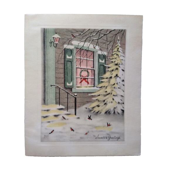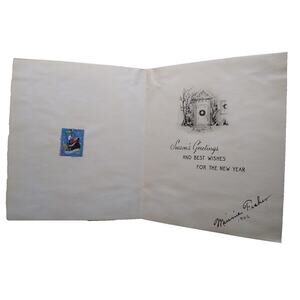 Circa 1940's-1950's vintage mid century modern original greeting card. Dated 1946. Artist initials on front PCN. Glitter accents. Has wrinkles, creases, and age wear. Back side has damage from album removal. Size is 6" x 5." opens larger. Stock#gc145.
