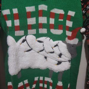 Christmas sheep sweater. green with a white fuzzy sheep. has multi color multi pattern sleeves. size small. long sleeve. brand is Derek Heart. 100% acrylic. hand wash cold inside out and dry flat. smoke free home.
