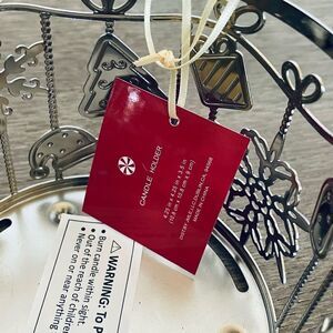 NWT silver metallic metal Christmas holiday winter design cutout candle holder sleeve. Fits a standard size glass jar candle.