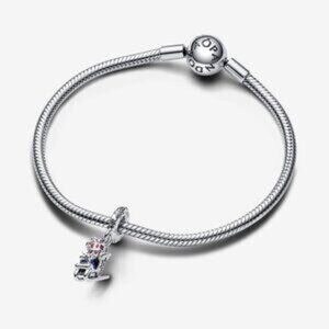 Jingle through the holidays with the Christmas Sleigh 2023 Dangle Charm. Engraved onto the back of the sleigh is an everlasting memory of the year. Glittery red and blue enamel brings even more shine to the gifts, while snowflake imprints cover the bail of this sterling silver dangle charm. Whether you want to carry a reminder of the festive season all year round, or infuse the holidays with extra sparkle, this sterling silver dangle charm will bring holiday cheer to any look.