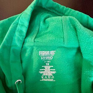 So cute an Christmas-y!! Snoopy and the Woodstocks putting the star on the tree. Hooded pullover sweatshirt. Very good used condition - see pictures for fabric content, washing instructions and measurements. No rips or stains, some minor pilling under the arms. I only wore it twice last Christmas season. I purchased this from Woman Within - their plus sizes tend to run rather large so please see the measurements in the photos!