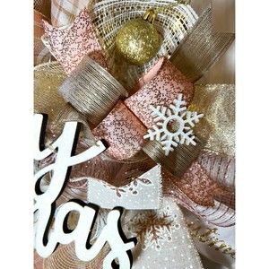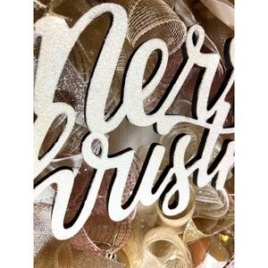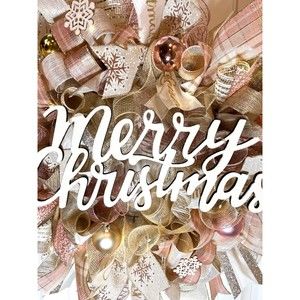 About 22 inches, 5 inch-deep door or mantle wreath. Champagne, Rose Gold, Ivory mesh back. December/ Christmas themed w/ vibrant neutral color wired ribbons (9 styles). “Merry Christmas” Wooden Glittered sign, matching glitter snowflakes & ball ornaments adorn this festive wreath.