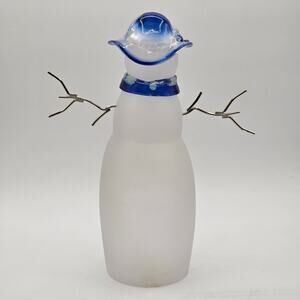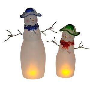 Frosty friends for festive feels! Set of two frosted glass and acrylic snowman figurines featuring painted faces, clear branch-style arms, and festive hats and scarves in blue, green, and red. Ideal for Christmas decor, holiday displays, or winter tabletop styling. Great condition with no chips or cracks. Keywords: snowman decor, frosted glass, acrylic figurines, holiday set, winter decor, festive display, seasonal accents, Christmas snowman. Stands approx. 12" tall (blue) and 10" tall (green). Pre-owned, excellent condition with no chips or cracks. Battery-operated lighting is NOT INCLUDED.
