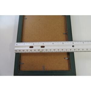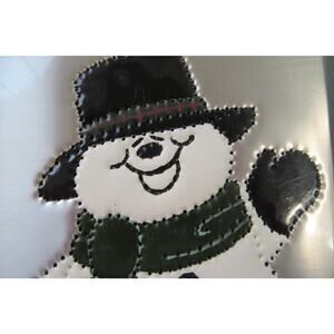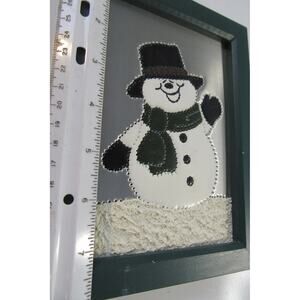 Christmas snowman in a green hat and scarf standing on textured snow with a silver background. Made of punctured tin in a green wood frame. Picture measures 6 x 8 inches.