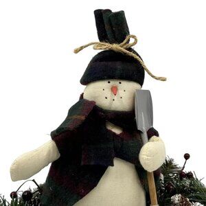 This charming snowman decoration features a cozy fabric outfit and stands amidst a lush, snowy wreath. Holding a shovel, it adds a touch of whimsy to holiday decor.