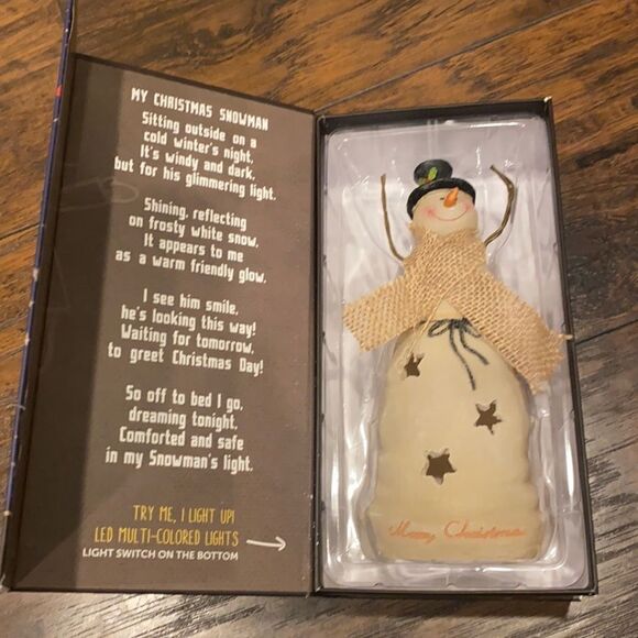 Christmas Snowman at Night~ New~Lights up~8.5” Tall ~ Cute Shelf Sitter