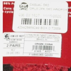 Two pairs of Wondershop kids holiday crew socks, size 9-11 XS/S. One pair is red with white snowflakes and the other pair is red and black plaid. Polyester fabric.