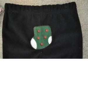 Pants are fleece pull-on style with a full elastic waist, cuffed bottoms and a stocking applique on the back