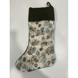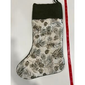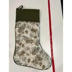 Christmas Stocking Cream Satin Olive Green Burlap Trim Pinecones Gold Details Measurements: appx - cuff to toe on diagonal 22" opening (laying flat) 8"