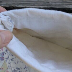 Never used, this Christmas stocking measures 14"H x 6.75" across the top rim (additional 2.25" hanging loop) and is made from and old quilt. The mulit colored body is a mixture of the star pattern and patchwork blocks. This stocking does NOT have a lining. There is also a small area where the fabric has worn away to show the batting, but does not go all the way through to the inside (see highlighted photo). Please take into consideration the age of the quilt used to make this stocking and the minor imperfections that may be present due to aging. From a smoke-free home. Offers welcome.