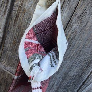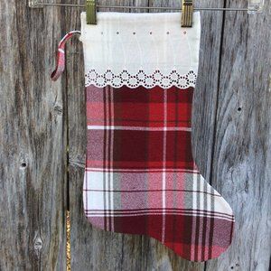 Never used, this Christmas stocking measures 16"H x 7 1/4"W across the top rim (4" hanging loop). The red, white and green plaid body is accented with a sweet eyelet linen cuff. Front and back side are identical. This stocking does not have a lining. From a smoke-free home. Offers welcome.