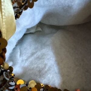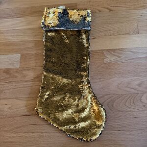 Christmas Stocking Reversible Gold Silver Sequins. Two tone gold and silver sequins. Rub one direction and they're gold, swipe the opposite direction and the stocking becomes silver--create your own design. Yellow hang ribbon. Interior is white felt flannel. Excellent, clean condition with no interior stains or tears. Like new condition.