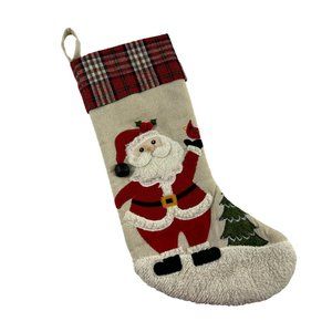 Christmas Stocking Santa Claus Plaid Red Bird Cardinal Tree Bell 18" in good condition.
