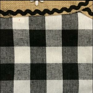 Black and White Plaid woven material and trimmed with a Natural Burlap Cuff and then embellished with a Snowflake. Perfect for Holiday decorating. Solid back in Felt type Material.