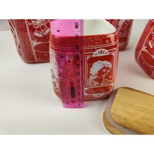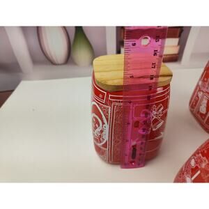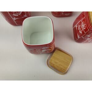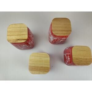 Porcelain Christmas Storage canisters with tight sealed wood lids. Comes with 2 larger and 2 smaller containers.