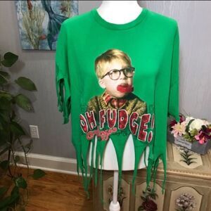 Christmas Story Oh Fudge Ralphie Upcycled Tee Fringe Green Sz XL
