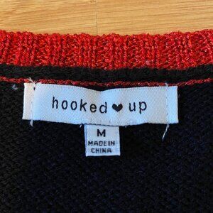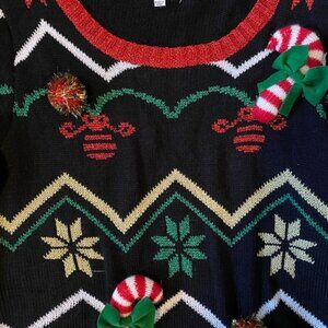 Christmas sweater with three stuffed candy canes and four shiny red balls.