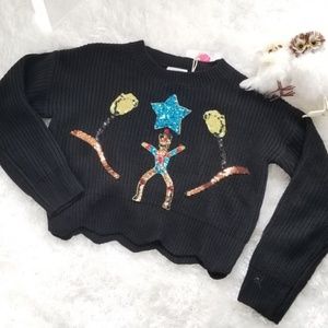 Fun sweater just in time for the holidays! This sweater features sequin detailing scallop hem line and a nice knit.