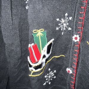 Get ready for the festive season with this Victoria Jones Christmas sweater in size Medium. The black sweater features a fun animal print design with sleds, pearls, and snow accents, perfect for adding some holiday cheer to your wardrobe. The long sleeve cardigan has a round neckline and button closure, making it a cozy and comfortable option for casual occasions.