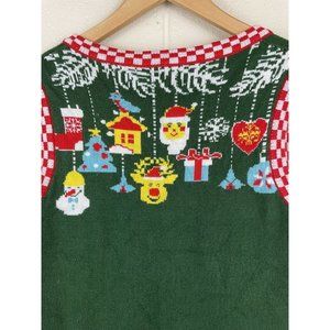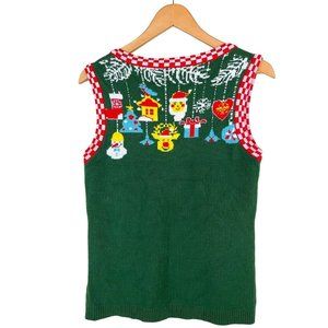 Christmas Sweater Vest Small Green And Red With Pixilated Deer, Ornaments, Santa