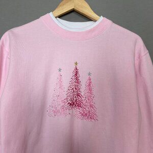 Christmas Sweatshirt Pink Embroidered Trees Women Size Small Festive Holiday Top