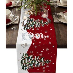 Christmas Table Runner - 108 Inches, Snowman Rustic Red Snowflake, 13"x 108"