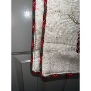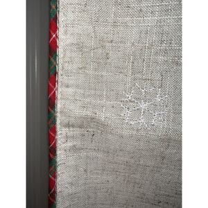 This is a beautiful and traditional Christmas table runner 70 inches long, 16 inches wide with the Christmas Tree w/ Presents appliqued and embroidered on each end. The back is a soft golden linen color. Edges all the way around are bordered with Christmas plaid fabric.