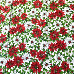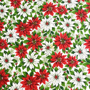 Vintage Christmas Tablecloth - brilliant 1980’s era lightweight cotton or cotton blend fabric table cover in a large rectangle shape. Gorgeous all over pattern of red and white Poinsettias flowers on a white background with plenty of greenery to really make the colors pop. Machine finished edges - no tags. Sadly there is a small stain in one area (see pics) - hard to see it in the overall pattern but it is there - my guess is that it will improve greatly with a careful soak but even if it doesn't this tablecloth is still lovely. In otherwise very good vintage condition with no significant damage or other flaws - just wonderful for a festive holiday table.