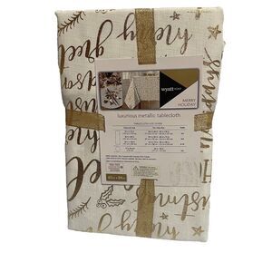 Add a touch of modern elegance to your Christmas dining table with this Wyatt Home tablecloth. The rectangular shape measures 60 inches in width and 84 inches in length, providing ample coverage for your kitchen or dining room. The white and gold metallic 100% polyester material is accented with Christmas Greetings text in a stylish and contemporary font. This tablecloth is easy to care for with its machine washable features, making it a practical addition to your holiday decor. Use it to complement your modern style or as a festive touch for your Christmas themed home.