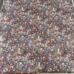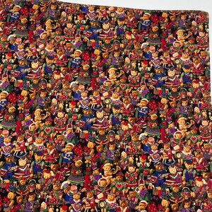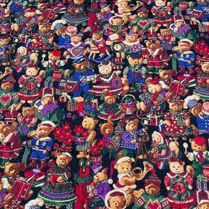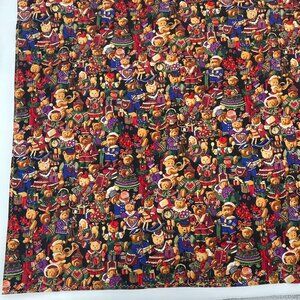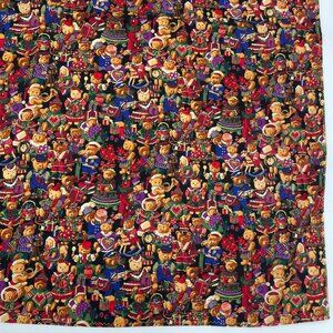 Handmade small card table sized tablecloth with an all-over print of bears dressed up in festive clothing.