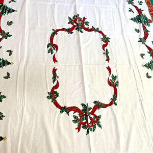 Vintage 1990's Christmas Tablecloth - cotton blend cloth printed in a festive holiday Christmas Tree swag design. Large white rectangle with red, green & gold border print. This cloth is perfect for a traditional or formal dining table. In excellent overall condition - minor/light wear - no significant damage or flaws - ready to use!