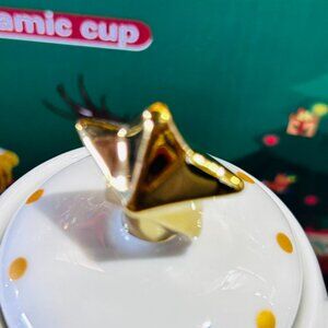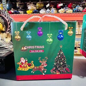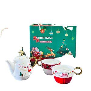 This Christmas tea set includes a teapot and two cups, featuring Santa Claus designs and festive illustrations. It's made from ceramic with elegant gold accents.