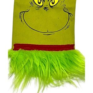 Handmade hanging towel for the kitchen or bathroom. Big red button closure to hang over a towel rack or oven handle, the Grinch's face, and a green, furry, hairy hem! Such a fun detail to add to any home Christmas decor!