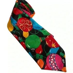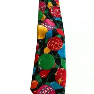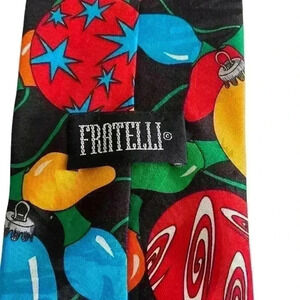 Fratelli Christmas Tie. Black background with Christmas ornaments and lights. 100% Polyester. Measurements laying flat: 3.75” tie front. Length 58.25”. Pet free smoke free environment.