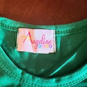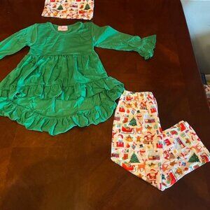 This festive toddler girl's outfit includes a stylish green ruffle dress paired with colorful Christmas-themed pants. Made by Angeline Kids, this 3T set combines comfort with holiday charm, perfect for enhancing your little one's seasonal wardrobe. Crafted from high-quality cotton and spandex for durability and stretch.