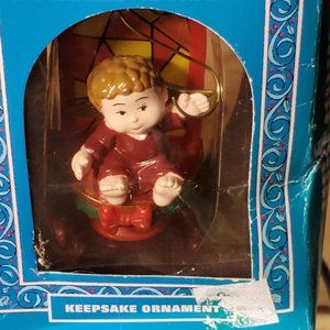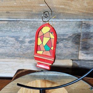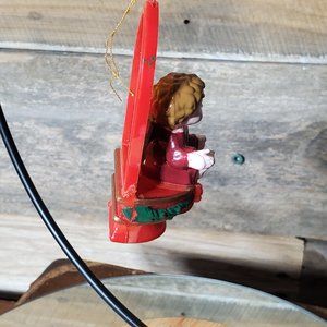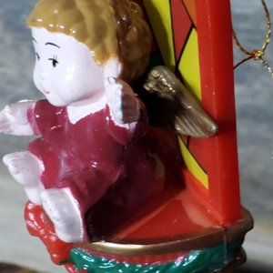 This cheesy little ornament was a 99c special back in the day. Comes unused in the box. Super cute cherub angel sits on a stained glass pedestal wrapped in a wreath and bow. Made out of sturdy plastic. I have added a gold scroll hanger to class it up. Measures 3 1/2" tall x 1" wide.