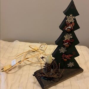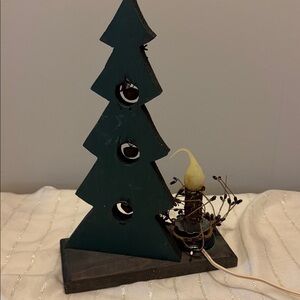 Country Christmas tree featuring a warm candle light, wooden and handmade! Approximately 13” tall. Adorned with festive red bows and snowflake accents, it's perfect for adding a cozy touch to your home.