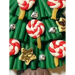 This intricately designed polymer clay brooch features a festive Christmas tree adorned with candies and stars. Its vibrant colors and detailed craftsmanship make it an elegant accessory for holiday outfits, adding a touch of whimsy and charm. The brooch is lightweight and easy to wear, enhancing any attire with seasonal cheer.