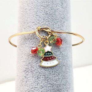 Christmas Tree Charm Gold Tone Cuff Bangle Adjustable Bracelet