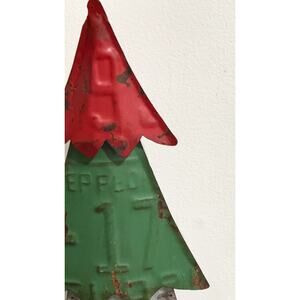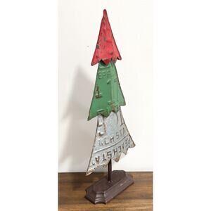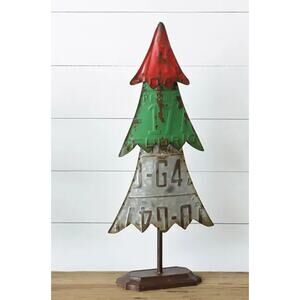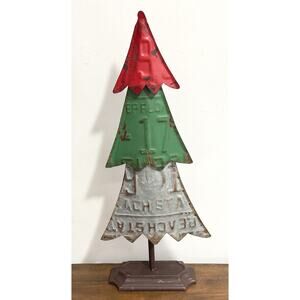 Add Christmas cheer and vintage-inspired charm to your decor with this Recycled License Plate Christmas Tree. This decorative metal tree comes with tons of detail and farmhouse character, you will want to arrange these tin trees on your console, mantel, or tabletop for a festive addition to any display.