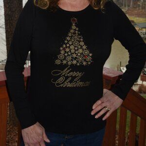 Custom made to order Christmas rhinestone and rhinestud bling black long sleeved round neck shirt.