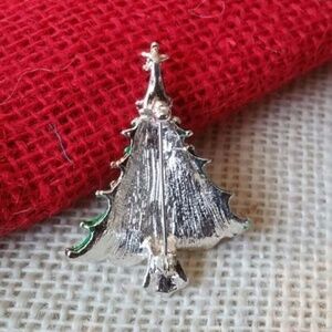 Silver-plated pewter metal Christmas tree with red and green hand-applied enamel accents and red acrylic rhinestone.