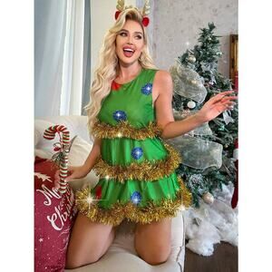 Get ready to sparkle this holiday season with this adorable Christmas tree novelty dress! This festive dress features a fun Christmas tree design with eye-catching gold tinsel trim that will make you shine at any holiday party. Perfect for spreading holiday cheer, this dress is sure to be a conversation starter. It is a size S (4). Grab it now and be the star of the show!