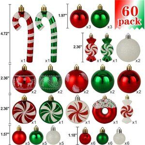🧿Traditional Christmas Tree Ornaments-there are 60 piece green red white ornaments in this Christmas ornaments set, small and big ones such as candy, donut, different size of balls, these ornaments all made out of shatterproof plastic, friendly for the family with kids and pets